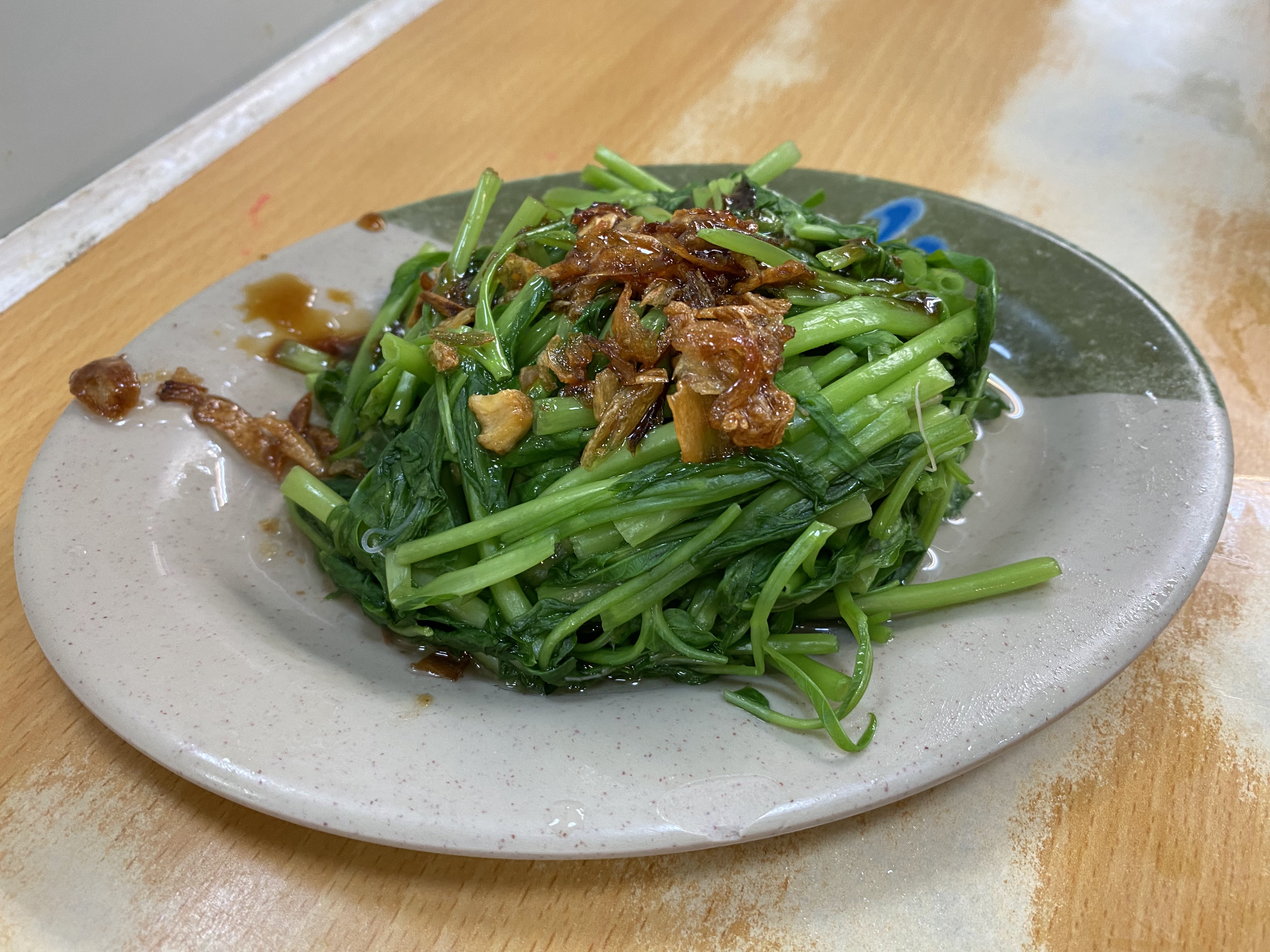 데친 채소 위에 간장, 마늘, 고깃기름 등을 얹어 낸 사이드 메뉴이고, 돼지고기 조림 덮밥과 곁들여 먹기에 정말 좋은 반찬이라고 합니다.