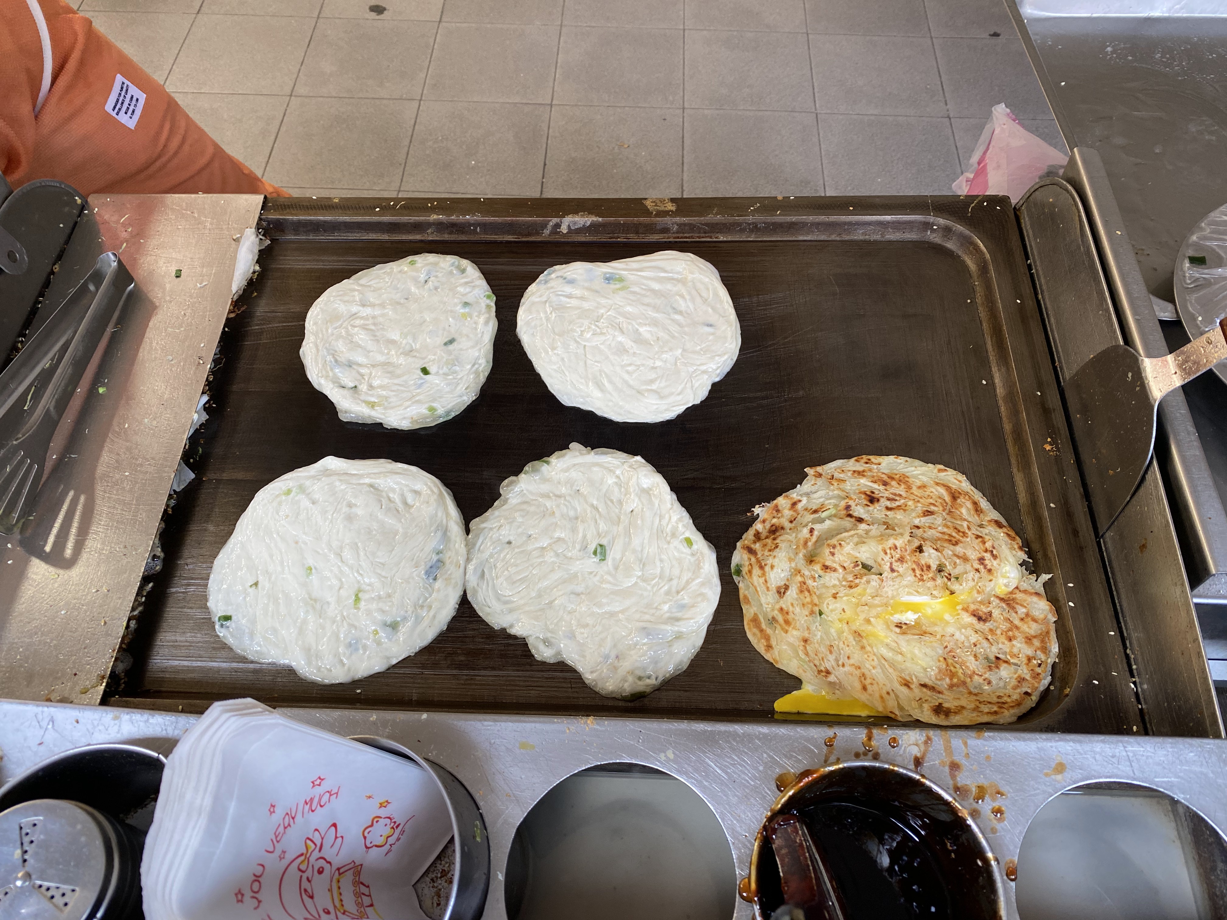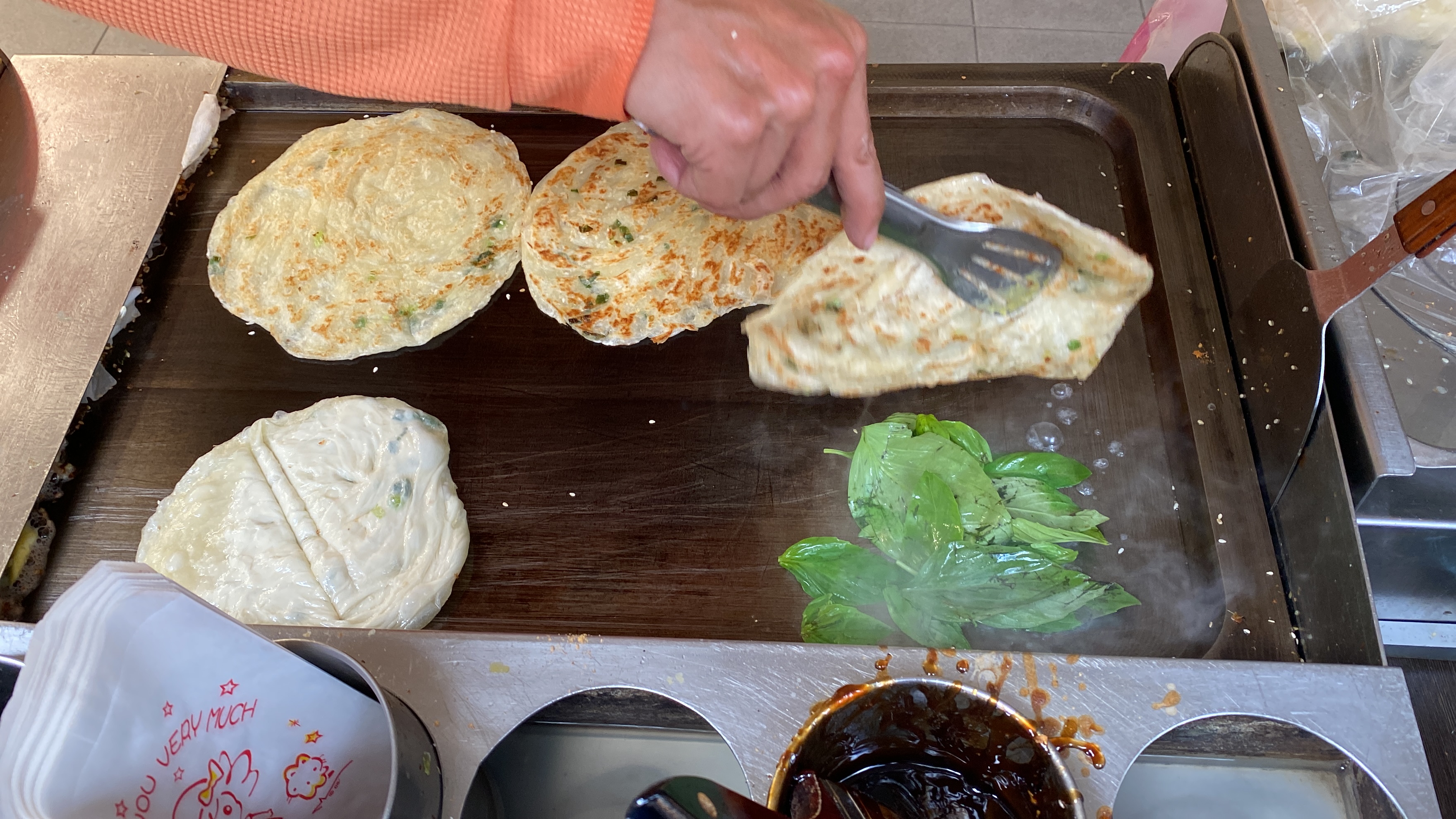 이렇게 철판에 밀가루 반죽 전병을 얇게 펴 익히다가 주문한 토핑을 따로 철판에 구우면서 나중에는 전병 위에 올리거나 전병과 겹치는 방식으로 메뉴가 만들어졌습니다.
